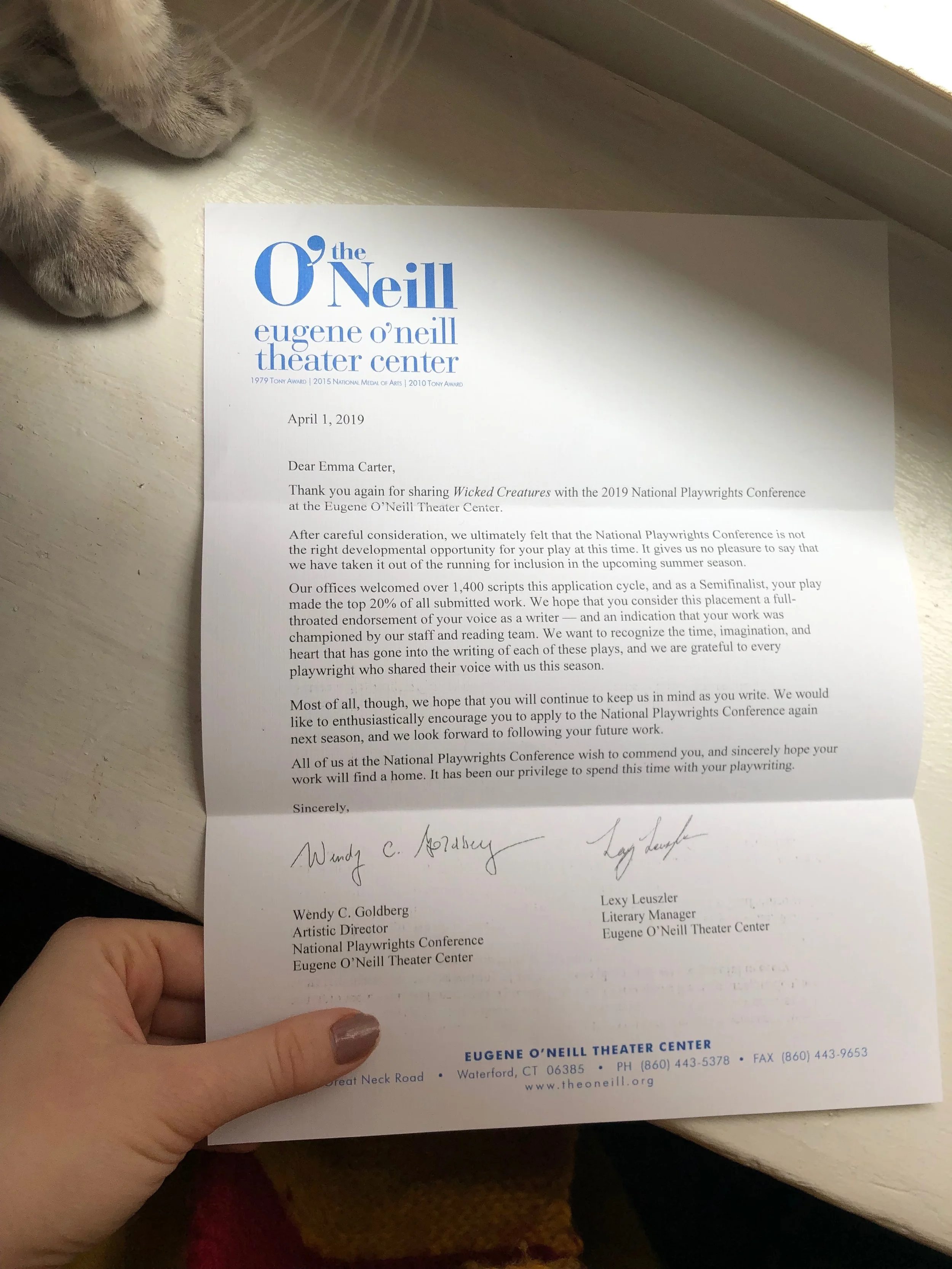 And the second bit of news—just today I received a letter in the mail. It was from the Eugene O’Neil Theater Center, stating that Wicked Creatures, which made it to the semi-finals for their National Conference, did not make it to the finals. Again, while I am disappointed, I’m also proud to know that I was within the top 20%. That counts for something. It certainly will inspire me to keep trying. (Also, the fact that someone took the time to print, seal and mail me this letter means a lot.)